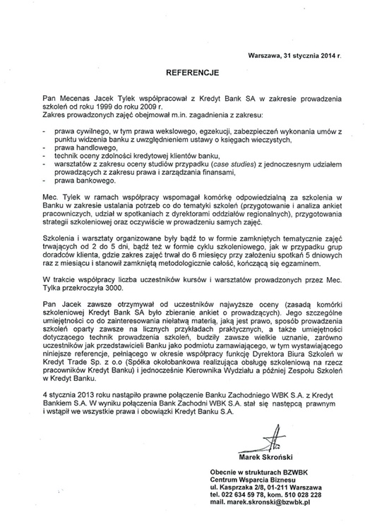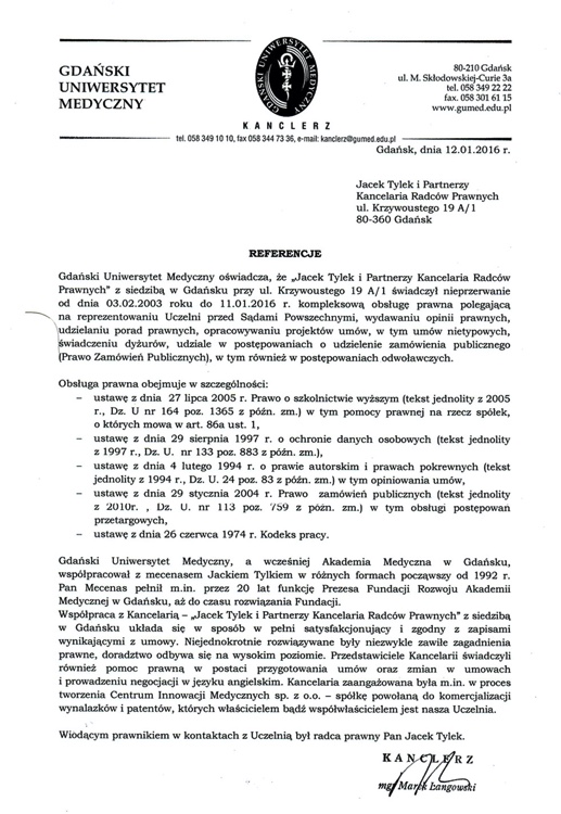 Usługi prawne świadczone były również i są nadal na rzecz m.in.:. ENERGA SA, ENERGA – OPERATOR SA, Gdańskiego Uniwersytetu Medycznego, Uniwersyteckiego Centrum Klinicznego, Szpitala im. Św. Jana w Starogardzie Gdańskim, Szpitala Miejskiego w Miastku sp. z o.o., Kurii Metropolitalnej Gdańskiej, Elektrociepłowni Wybrzeże S.A., voestalpine Signaling Poland sp. z o. o. i in.